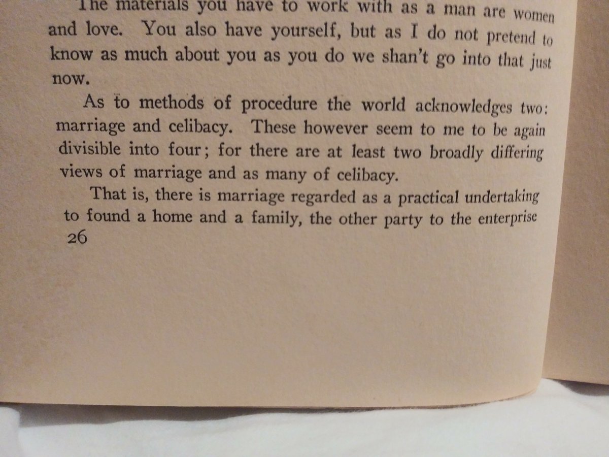 on "pre-marital frankness," and marriage as a contract: "...the most credit you can give the plan is this clarity of name. It has the virtue of a Pure Food and Drugs Act which without prohibiting adulterants insists that the label declare plainly the contents of the bottle."