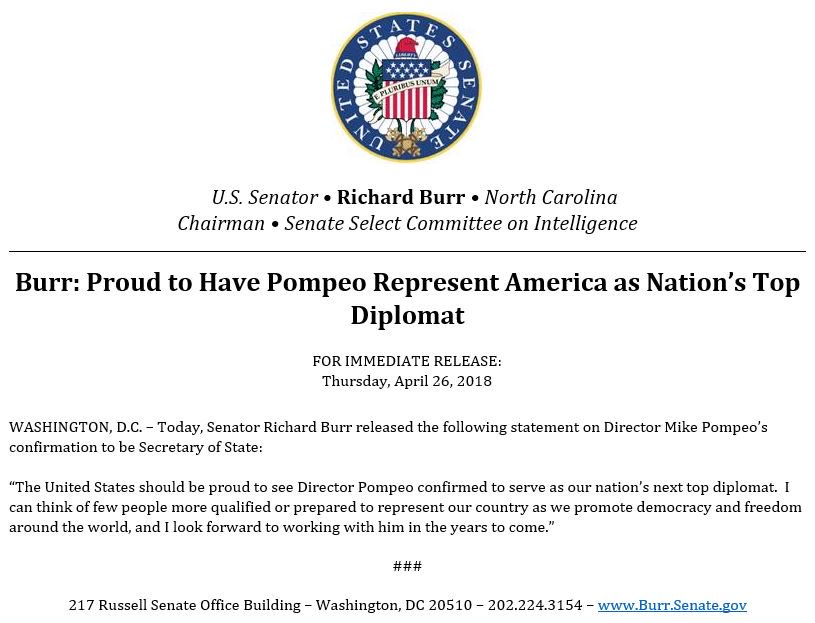 Director Pompeo is eminently qualified to be our nation's top diplomat. I hope my colleagues will join me in supporting him to continue to serve his country as he has in the U.S. Army, the House of Representatives, and the CIA: with honor and distinction.https://youtu.be/ei5vtxeOu2Y