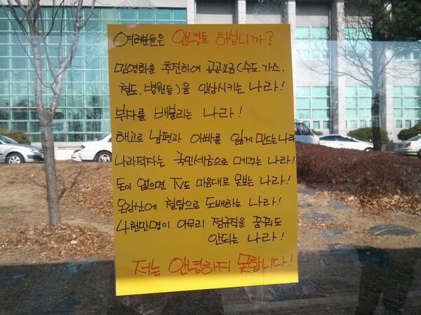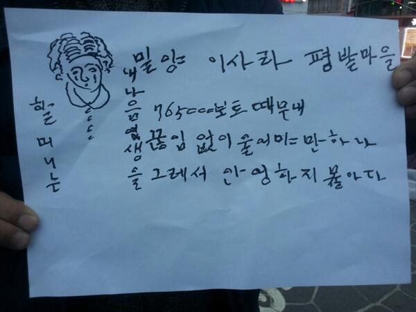 이 시간 밀양사진 - 할매의 대자보. "밀양 이사라 평밭마을 할머니는 남은 여생을 765000볼트 때문에 끊임없이 울어야만 한다 그래서 안녕하지 못하다"pic.twitter.com/ThJPHHBRrs