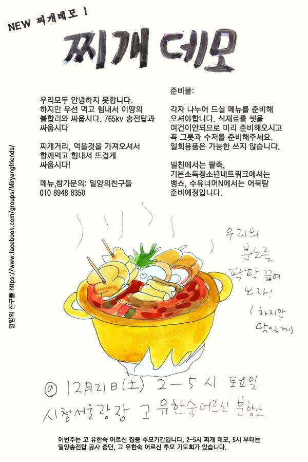 안녕하십니까? 안녕하지 못한 밀양어르신들과 찌개 끓여먹읍시다 팥죽도 끌여봅시다 ~!! 뜨겁게 연대해보아요 참여 대환영~~~~pic.twitter.com/LwiEQTeTvS