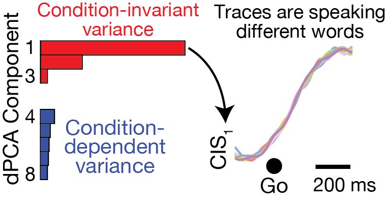 Neural dynamics motif #1: Population activity is dominated by a large condition-invariant signal (CIS) when initiating speaking. Here we applied the methods of Kaufman et al 2016 (