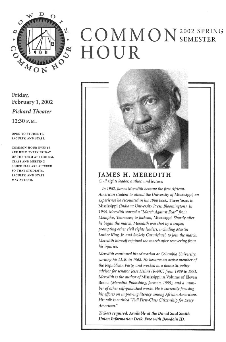 #OTD, 2002: Civil Rights leader James Meredith delivers a Common Hour talk to a capacity crowd in Pickard Theater.pic.twitter.com/Bx2LA5A7o4
