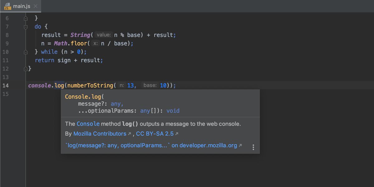 Need to quickly check docs for the standard JavaScript methods but don’t feel like googling? Press F1 to invoke the documentation popup and go to the corresponding MDN page for more details right from there.