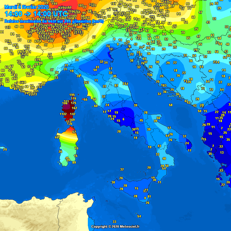 EXTREMELY severe winds across Corsica (France) today. Peak gusts up to almost 200 km/h in some areas! Such gusts are produced by the overall severe mistral winds coming from SW Alps, accelerating additionally downslope from the higher terrain across Corsica. Maps: