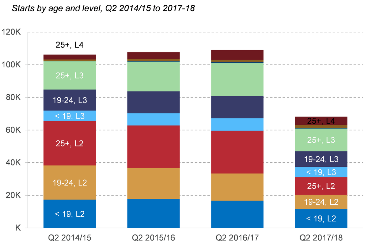 This fall in apprenticeship starts in the latest quarter suggests that reforms are weeding out poor quality provision. However, the fall in starts for young people is a big concernpic.twitter.com/Rvk1dgWONS