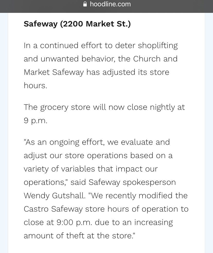 NEW: Safeway at Church/Market is cutting back store hours due to shoplifting. Statement here: (published @Hoodline Oct 29,2021)pic.twitter.com/sLUrjB9M8W