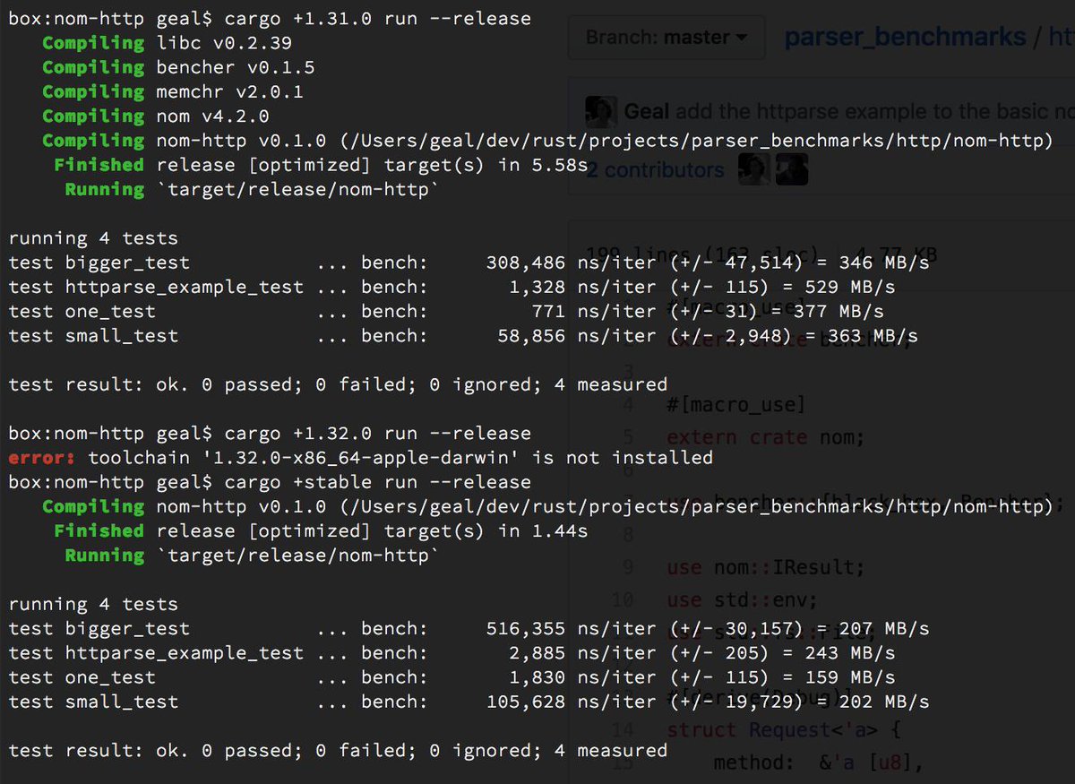 what the actual fuck. How. How can it be that much faster already. Top results are from https://github.com/rust-bakery/parser_benchmarks/blob/master/http/nom-http/src/main.rs … (not the simd optimized one) Bottom is the version with functions: https://gist.github.com/Geal/f447cdee0e305954b840e4b47683acd6 … just a naive translation, did not optimize anything. what is happeningpic.twitter.com/mb9fUu6U5A