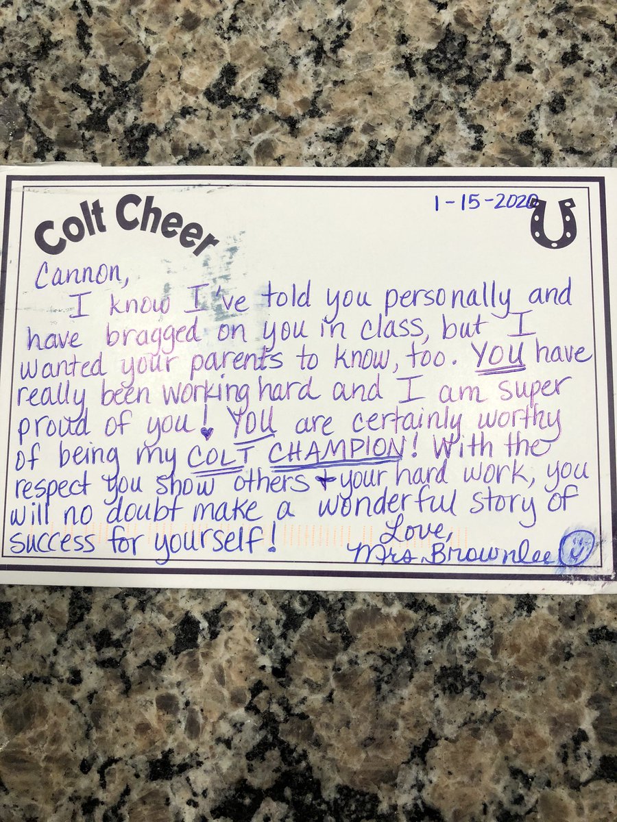 I have to brag on my son and his teacher for sending this handwritten note in the mail. It’s sad that teachers don’t get the positive praise they deserve. This made my day and helped me see another side of my son I don’t always see.