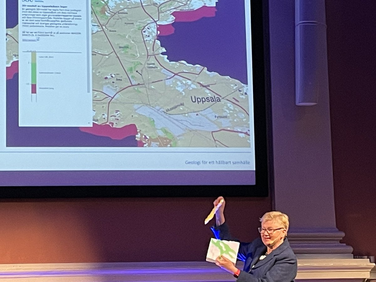 Eva Wendelin på SGU visar en 3D-modell över Uppsalas grundvattentillgångar.