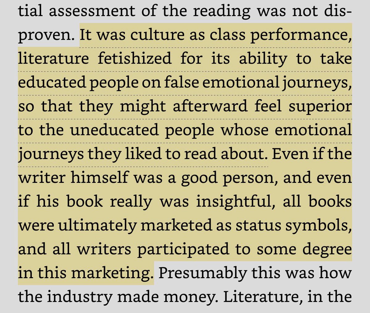 “culture as class performance” really captures my discomfort around the way reading/liking certain books becomes way more about signaling ingroup status than enjoying or gleaning insight from the book itselfpic.twitter.com/jwEuEPdPfr