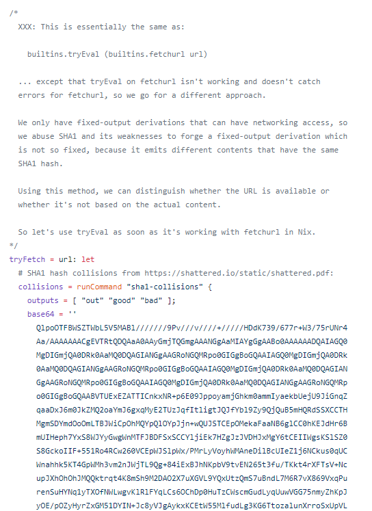 this morning in "computer nightmares" i found the ultimate nightmare inside of Nixpkgs: purposefully crafting SHA-1 collisions to support Google Chrome's update mechanism, due to its non-deterministic download URLs. what the fuck https://github.com/NixOS/nixpkgs/blob/master/pkgs/applications/networking/browsers/chromium/update.nix …pic.twitter.com/Vj5XQE56RT