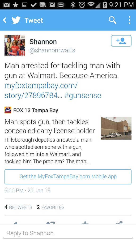 @shannonrwatts So you're promoting assault on someone who is observing his legal rights? You've lost it lady.Thanks. Twitter will use this to make your timeline better. UndoUndo