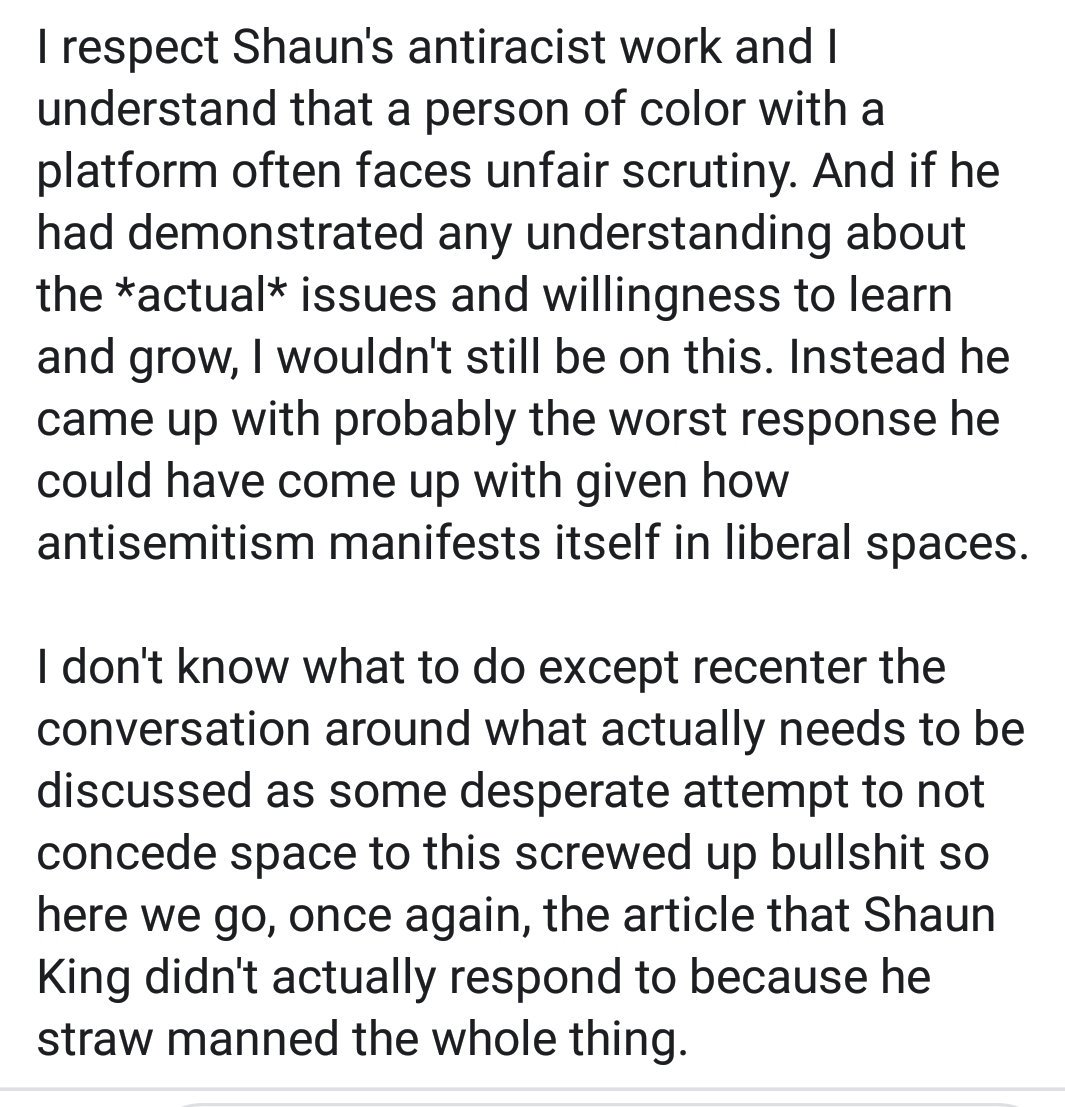 One of the screen shots got cut off. Supposed to say "absolutely warrants criticism." Here is the article:http://www.tabletmag.com/jewish-news-and-politics/263136/shaun-king-anti-semitism …