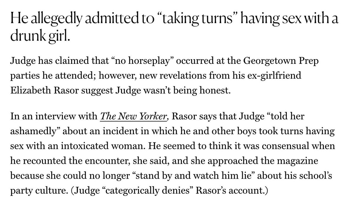 “Boofing,” “100 kegs or bust,” “Beach Week Ralph Club,” “Devil’s Triangle,” “Renate Alumnius”—all sex and binge-drinking quotes from Kavanaugh’s yearbook page, the relevant timeframe of the assault. Not even close to being a respectable Catholic Church boy.