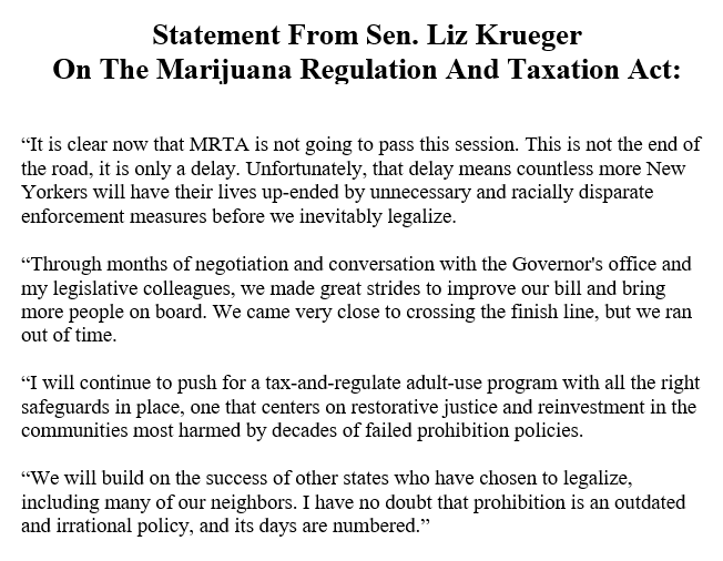 Unfortunately, it is now clear that #MRTA will not pass this session. This is only a delay, but that delay means countless lives will continue to be upended by unnecessary enforcement. I will continue to push for #MarijuanaJustice and a rational, legal adult-use policy. pic.twitter.com/uPapIFcB56