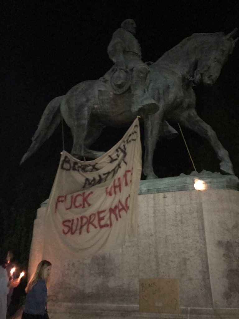 A mob of anti-Americans spouting treacherous unity with Russia in front of a statue of one the biggest Traitors in American history.