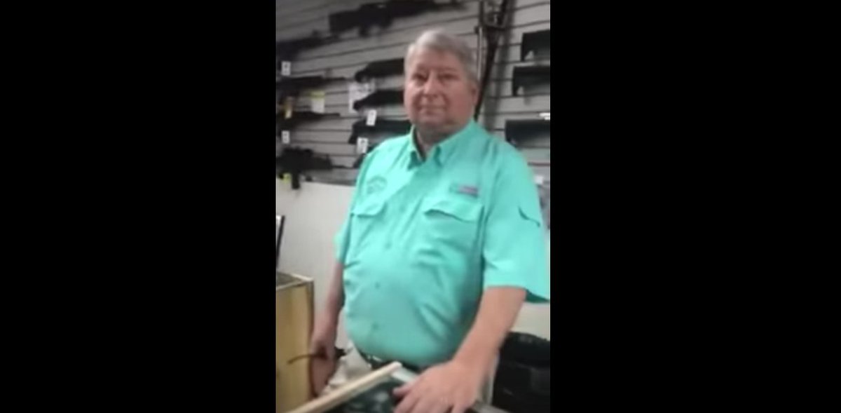 The last dude gets mad, because the guy is swearing and there are kids in the store yet he doesn't have a problem having kids in a GUN store...