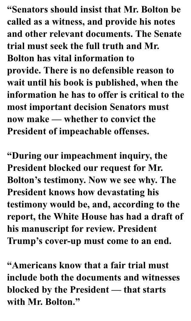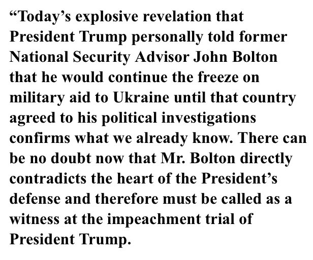 INBOX: House impeachment managers release a statement on the NYT report on Bolton. “There can be no doubt now that Mr. Bolton directly contradicts the heart of the President’s defense and therefore must be called as a witness at the impeachment trial of President Trump.”pic.twitter.com/STj70OJJTl