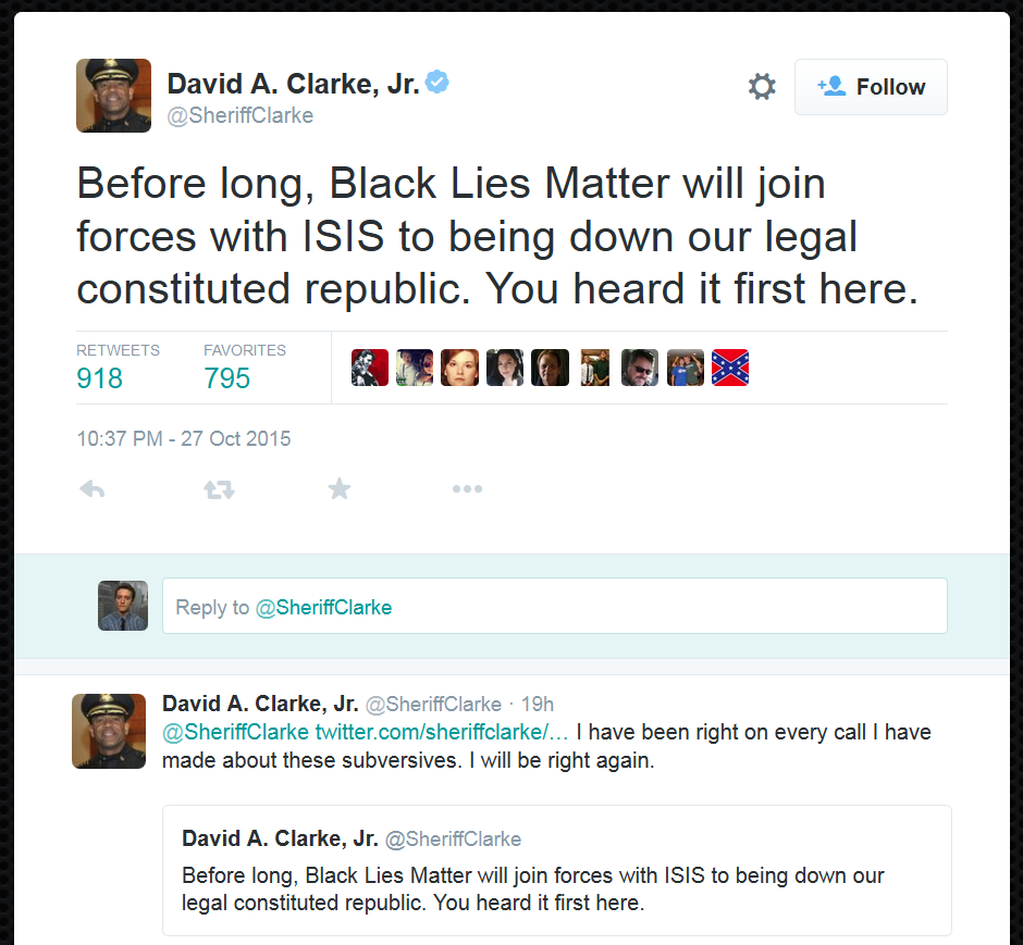 @SheriffClarke insists Black Lives Matter civil rights activists are going to join ISIS.pic.twitter.com/ds74Peduw9