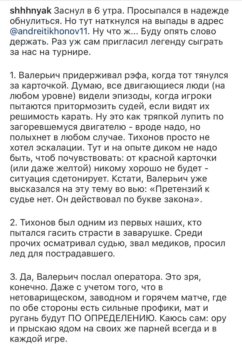 Дмитрий, незнание освобождает от ответственности? И что, что Тихонов не знал о сути турнира. Я и сейчас не знаю, да и насрать. Есть человеческое отношение. Оскорблять оператора, посылать, трогать судью во время матча, явно пытаясь замять всё - это норма. Ему можно, да?