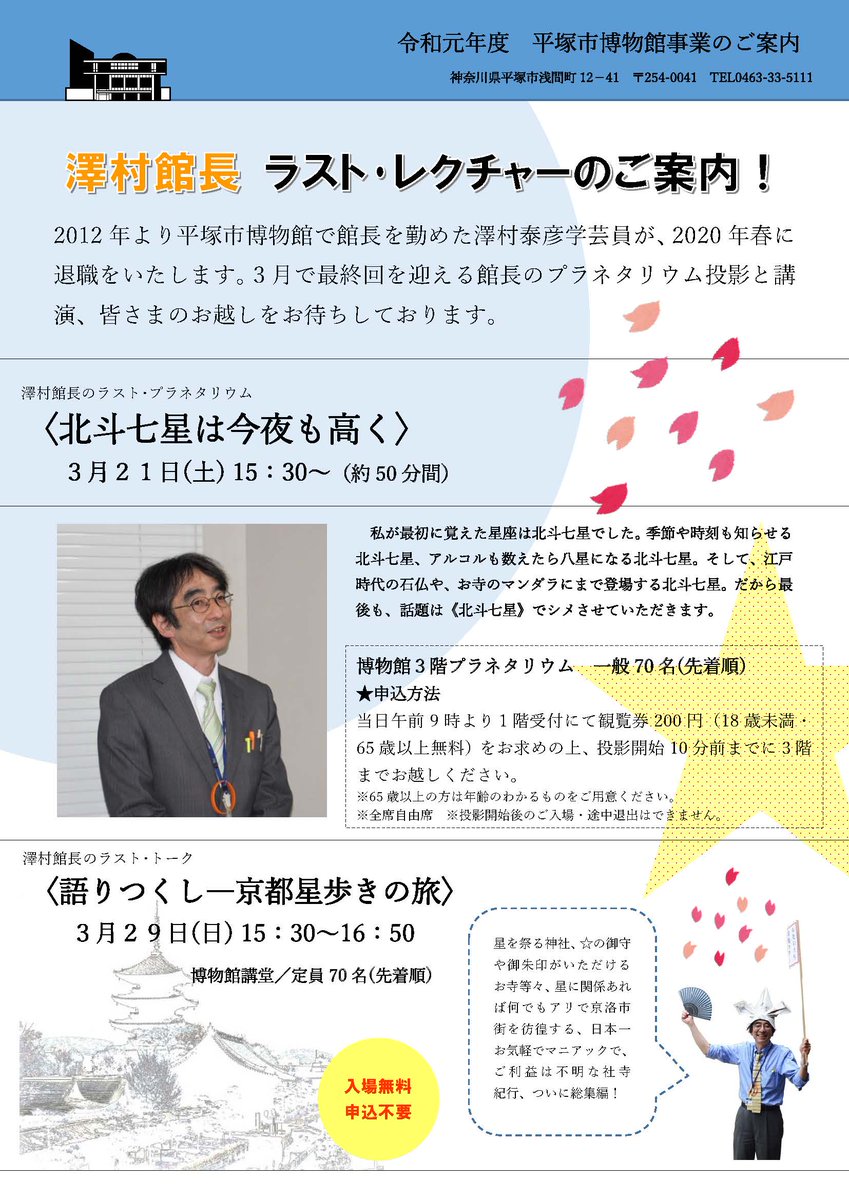 平塚市博物館の館長で天文の学芸員であった澤村が今年度で退職となります(再任用で博物館に残るかどうかは未定です)。つきましては、プラネタリウムの最終投影(3/21・土)と最終講演(3/29・日)を行うことになりましたので、ご興味がある方はぜひお越しください。お待ちしています。pic.twitter.com/XpvvrdOAPy