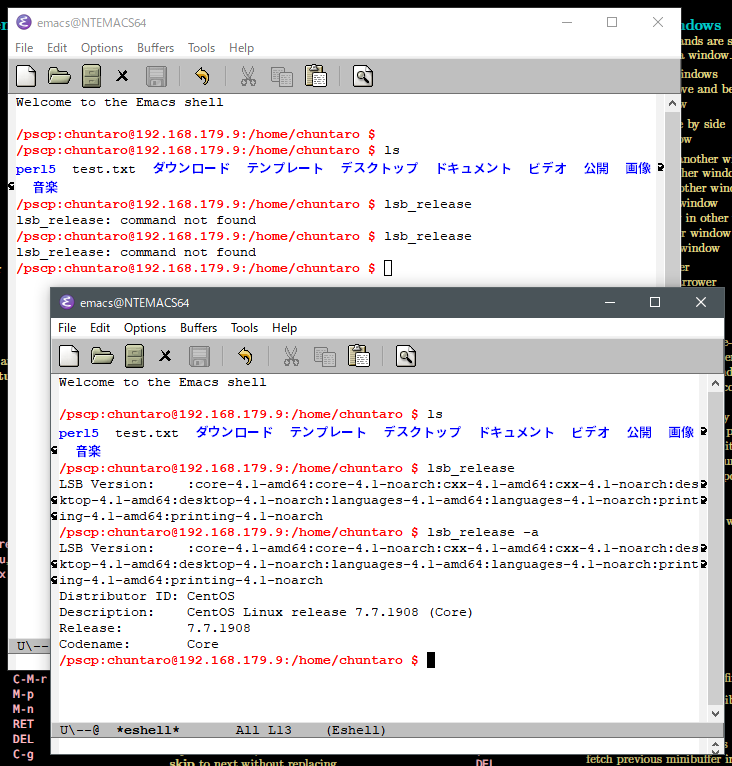 Emacs 26 までは tramp 越しに eshell 使ってもまともに使えなかったのが、27 で普通に使えるようになってる! これは捗る! (奥が 26 で手前が 27。念の為 -Q で動作確認したので、見た目はダサいですw)pic.twitter.com/yQzObFyeFl