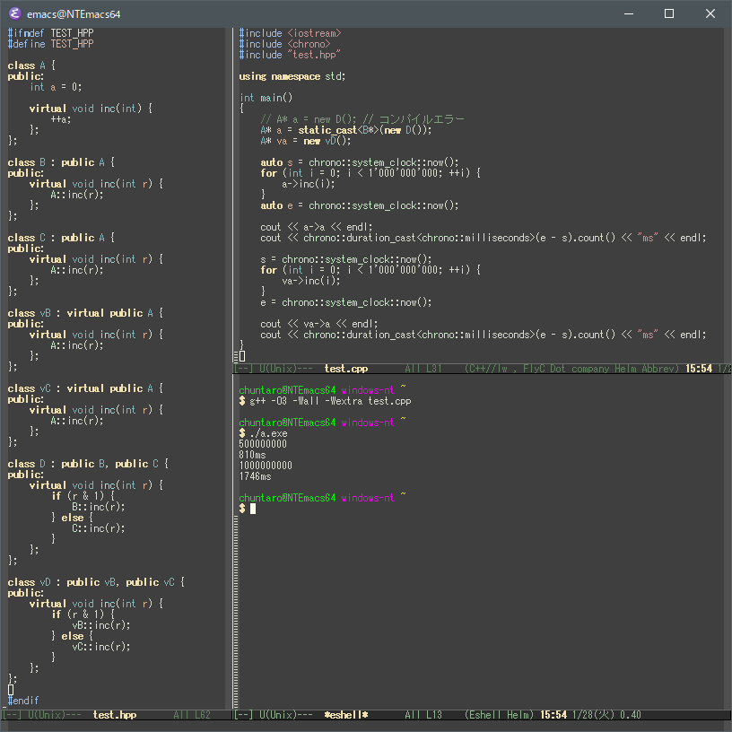 仮想継承時の仮想関数呼び出しがどれだけ遅くなるか、ベンチマークしてみた。 この状況だと倍遅くなった。(正しい計測コードになってるかは若干不安が有るが…) https://gist.github.com/chuntaro/90e128e6df735db406739f4f4c483b70 …pic.twitter.com/vbUPt2sZom
