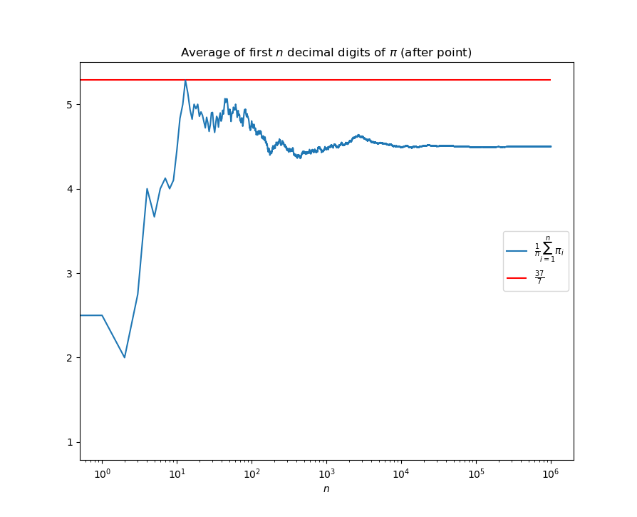 Conjecture: the average of first n decimal digits of π after the point never exceeds value 37/7, which is reached after 14'th digit. The proof is probably way out of reach for modern mathematics. Probabilistically, the chance of it being false < 10^(-39000)pic.twitter.com/0RfiWjHQnC