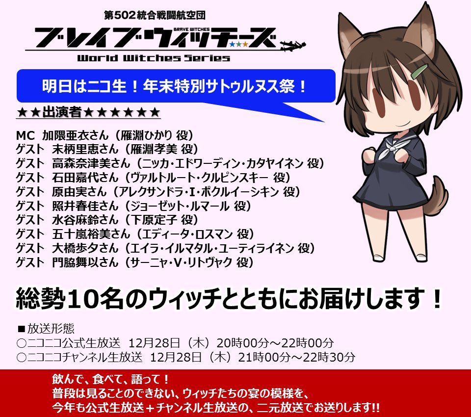 【ニコ生】もういくつ寝ると…そんな師走ですが明日は待ちに待ったサトゥルヌス祭!MCの加隈さんほか、総勢10名のウィッチたちとともにお送りします!画面に全員収まりきるのか…それはどうぞ見てからのお楽しみ!いつもより30分早めの20:00からお送りします!