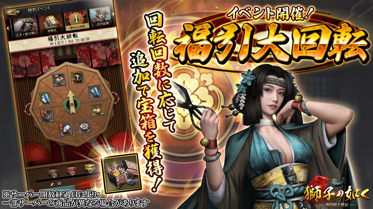 【福引大回転】 本日より「福引大回転」を開催しております! 両金を消費して福引を回し、報酬を獲得いたしましょう!