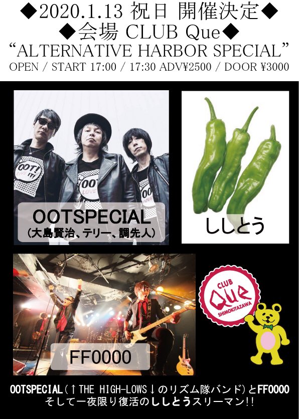 *Today LIVE* 2020/1/13(mon.)@下北沢CLUB Que 『ALTERNATIVE HARBOR SPECIAL』 OOTSPECIAL/ししとう/FF0000 OPEN 17:00/START 17:30 *play 18:20〜 adv.¥2,500+1D/door.¥3,000+1Dpic.twitter.com/L6aiu6H39R