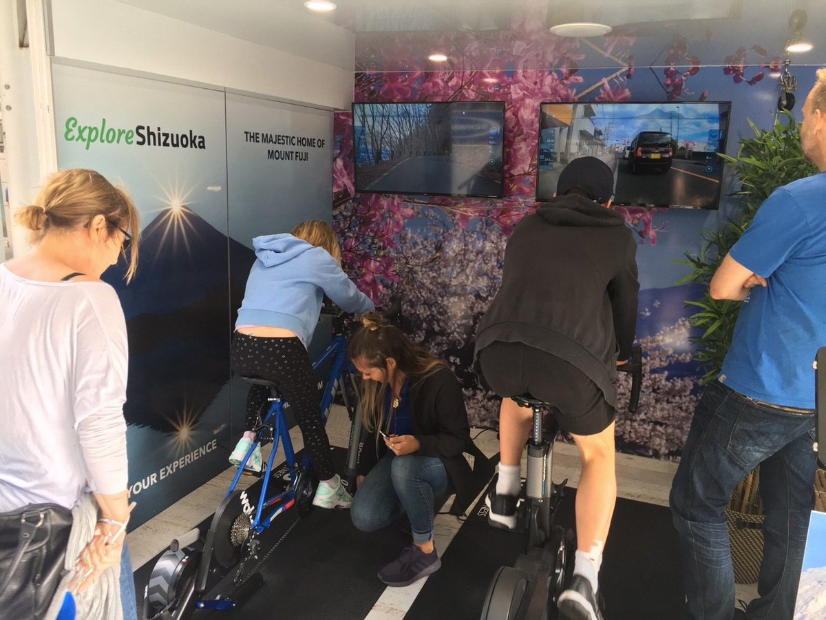 富士山周辺のオリンピックコースや、浜名湖などのサイクリングコースの映像を見ながら乗るバーチャル試乗が人気です