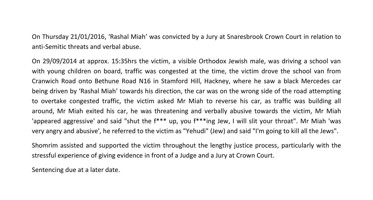 << Sentence Update: 'Rashal Miah' also needs to attend Anger Management course, do 100 hours unpaid work & pay £980https://twitter.com/Shomrim/status/690175613206990848 …