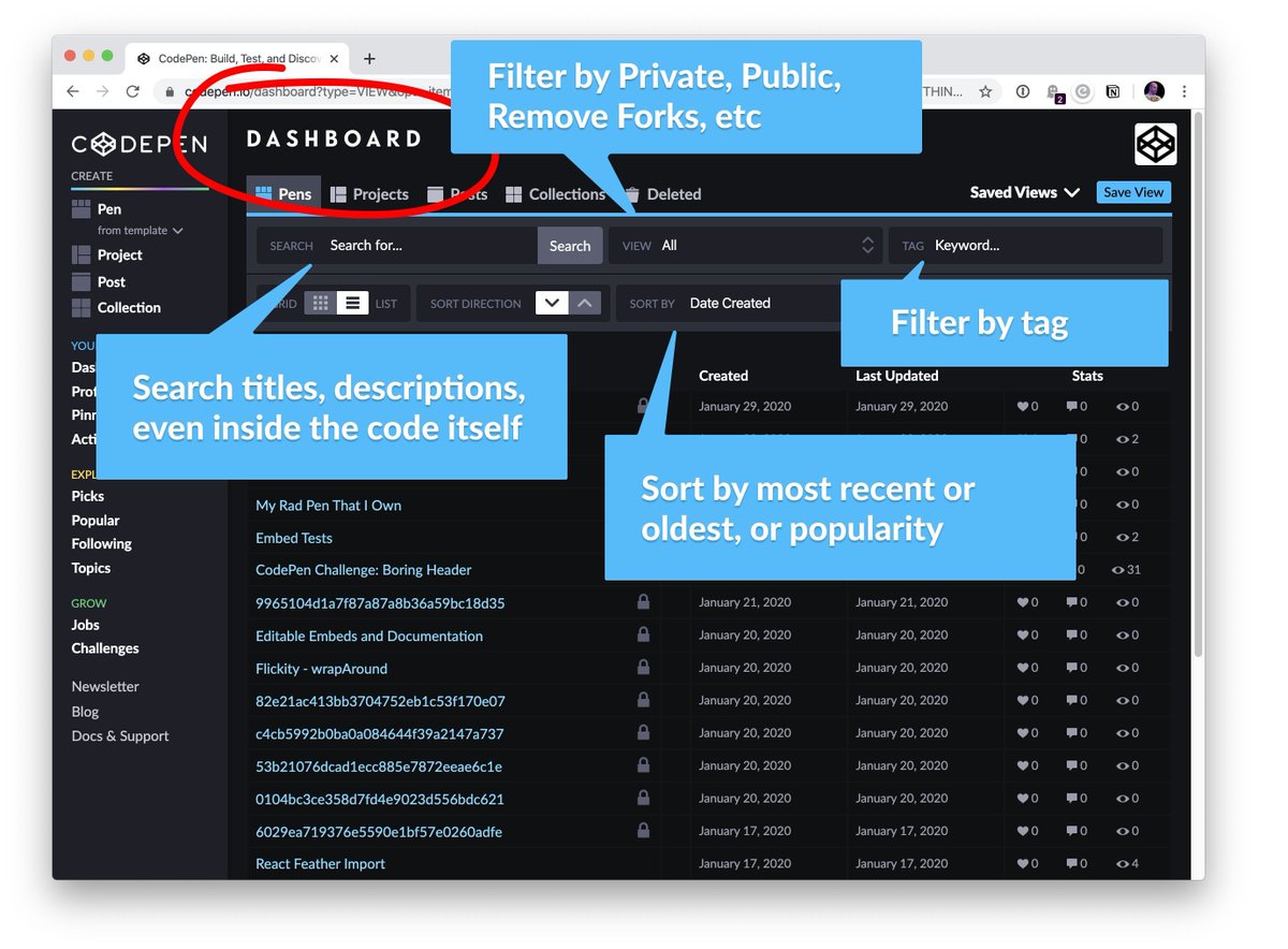 The Dashboard is your portal to everything you (or the PRO Team you are on) have created. It has powerful search ability, looking into the code itself. Plus lots of filters so you can narrow down what you need. It will remember it's last state and can save views to jump back to.pic.twitter.com/NGL1pxpLUD