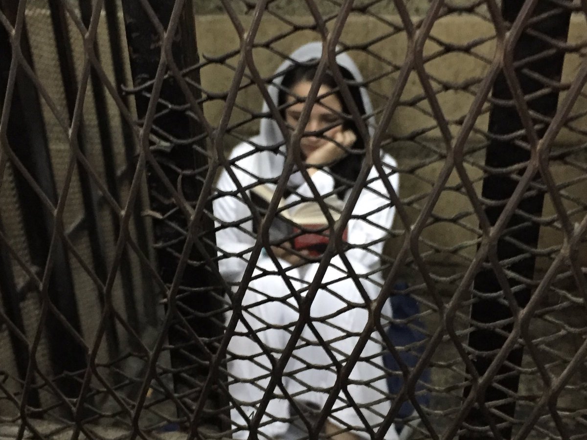 Aya Hegazy sits on the floor in the defendants cage and reads as she waits for the verdict.