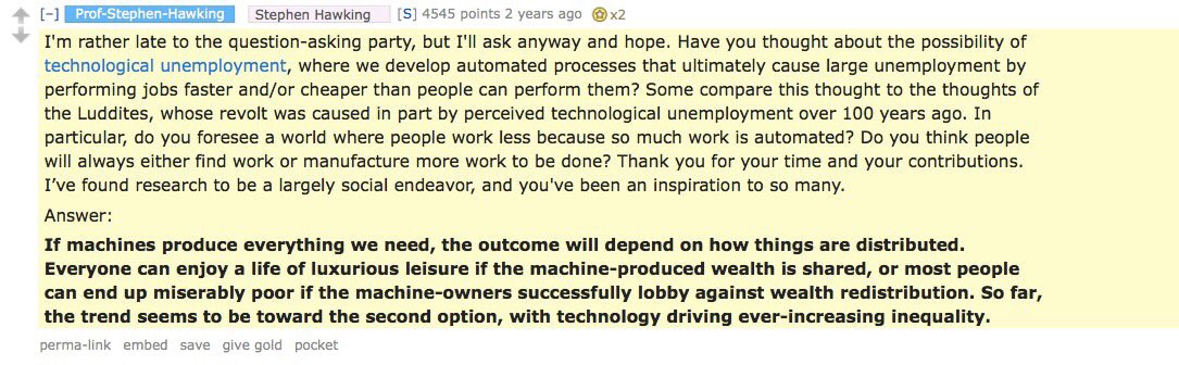 Stephen Hawking's final comment on the internet highlighted the reality that technological advancement itself isn't the core threat that humanity must face; Capitalism is. Rest in Power.pic.twitter.com/IedH8Sipaz