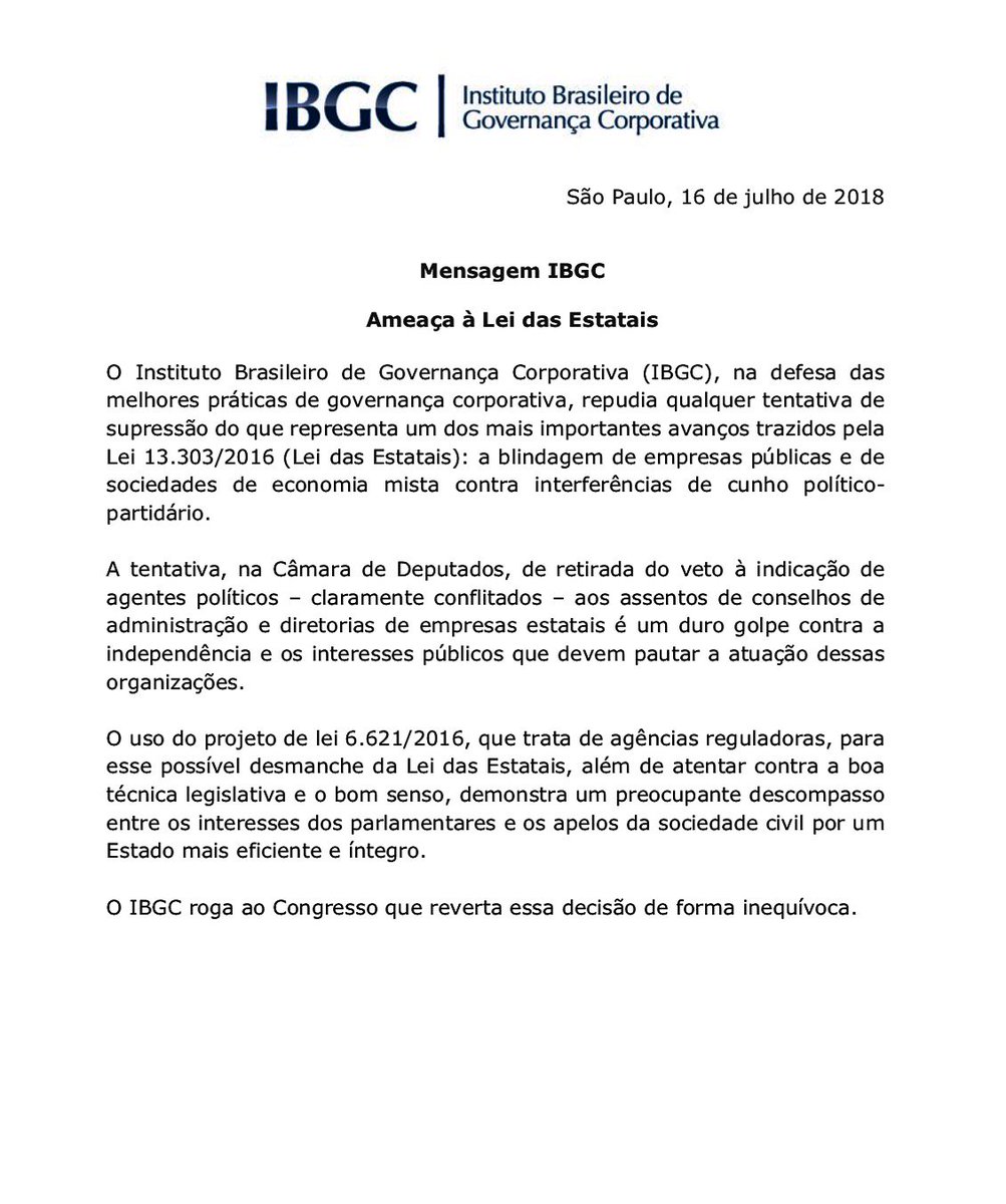 Sociedade civil está agindo para pedir melhor governança e evitar que o ambiente promíscuo revelado pela Lava Jato se perpetue nas estatais. O retrocesso é de autoria do deputado José Carlos Araújo, do PR da Bahia. Alô Bahia, Vocês concordam?https://twitter.com/ibgc_brasil/status/1018928735070949376 …