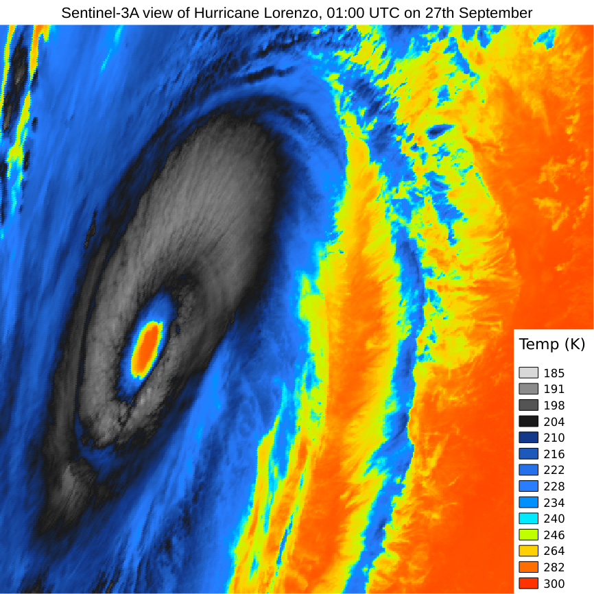 Hurricane #Lorenzo seen by the @CopernicusEU #satellite in the early morning of Sept 27th. This is a thermal view, showing the temperature in Kelvin, the coldest clouds in Lorenzo are 187K (-86C). Brrrr!pic.twitter.com/G7l9to7IVz