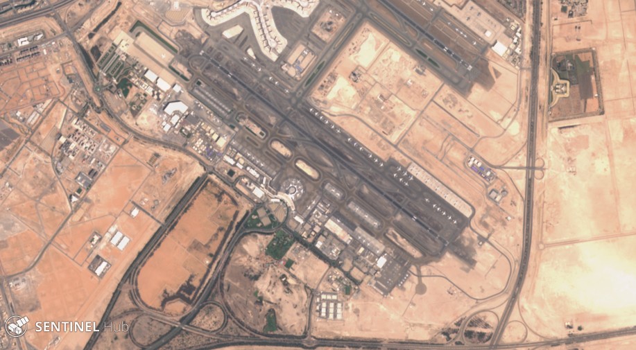 A satellite view of Abu Dhabi airport taken on 1st April. Lots of aircraft parked on taxiways, not going anywhere during the ongoing travel restrictions!