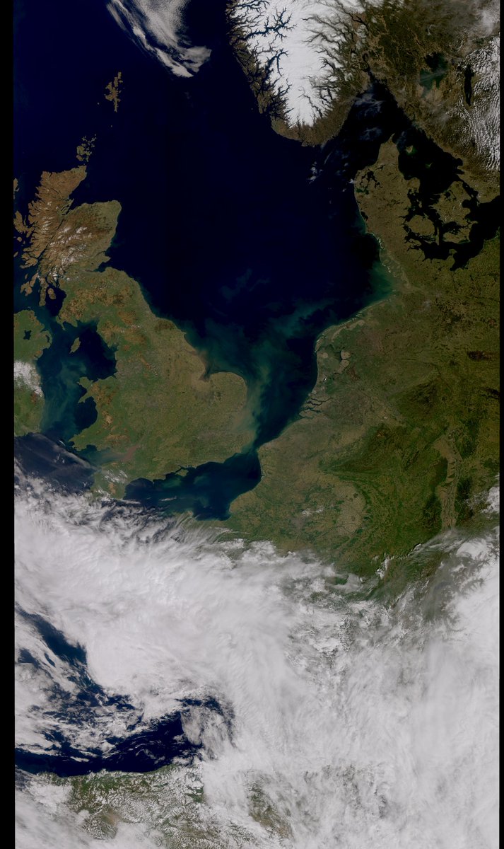 A lovely view of North-West Europe from @CopernicusEU's #Sentinel3B satellite, taken yesterday (04/20). Much of the UK and continental Europe is cloud free, and the colours in Southern North Sea are wonderful!pic.twitter.com/PPxsQoyKAN