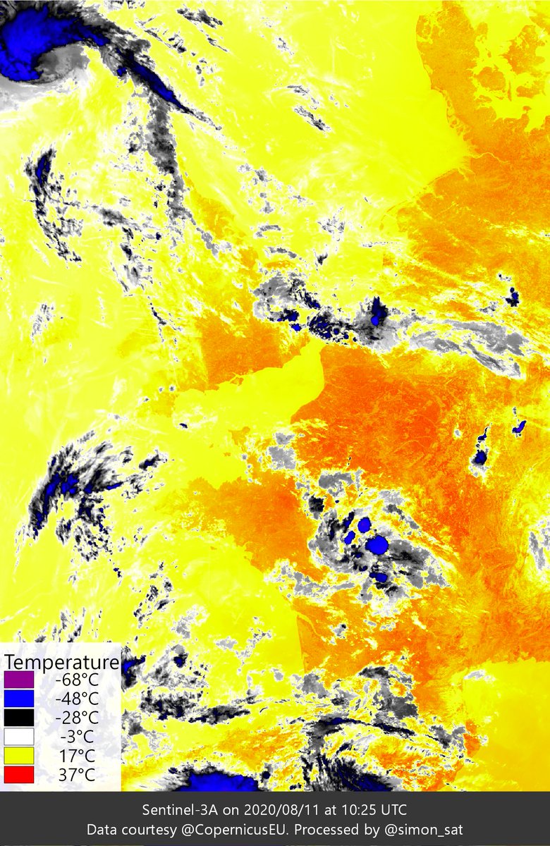 Some wonderful views of Western Europe courtesy of the @CopernicusEU Sentinel-3 satellite, taken earlier today. Look how brown the soil is, especially around Paris Also, check out those surface temperatures: 37C in parts of France, several hours before the daily peak!pic.twitter.com/WwzI2tiYnO
