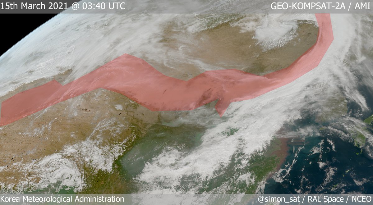 Wow! This picture from the Korean GK-2A satellite shows a huge cloud of dust stretching the entire width of China. That's over 5,000km (3,100miles), and has brought a sandstorm to Beijing!pic.twitter.com/6GJcFnJwOh