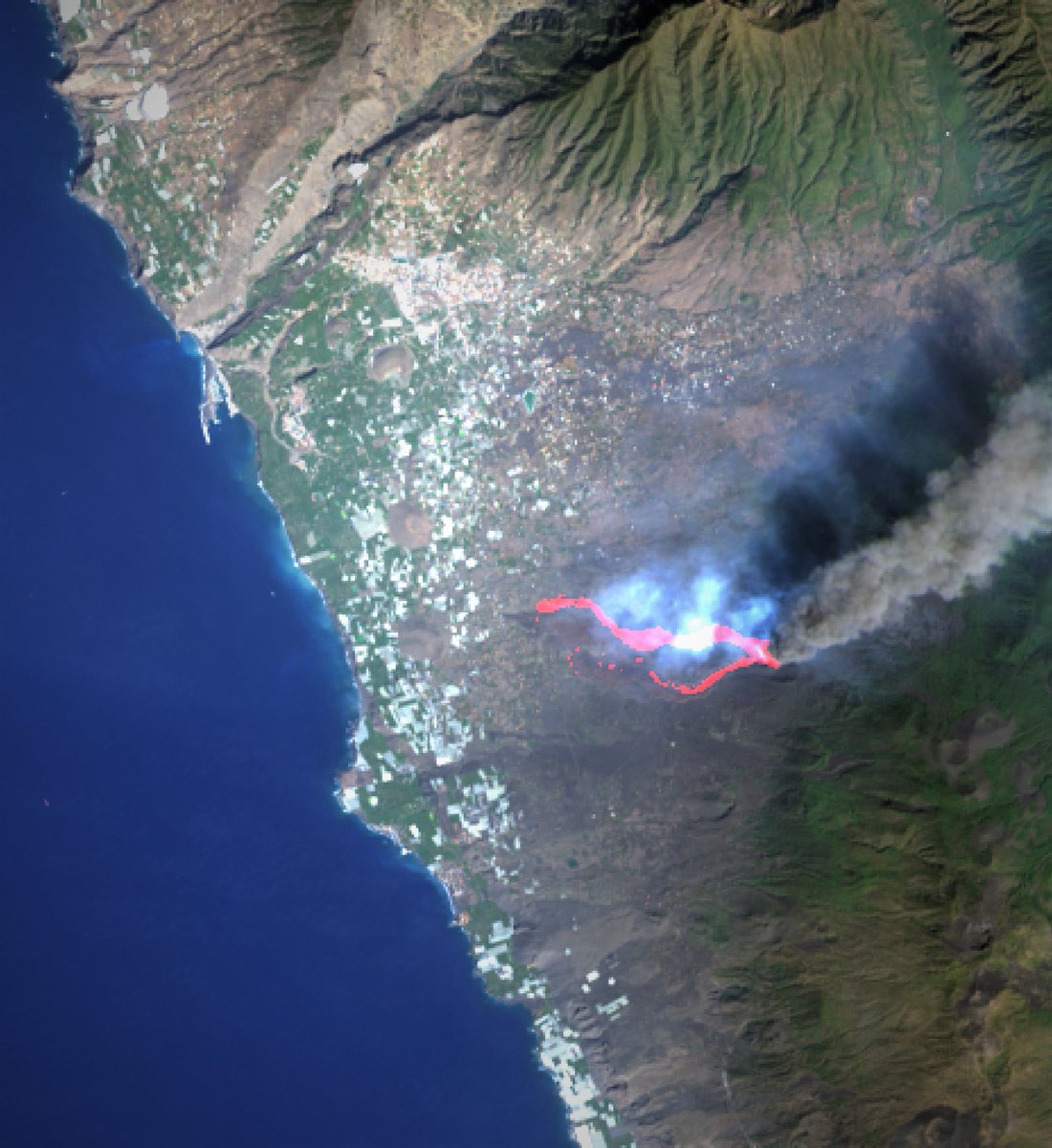 The eruption of Cumbre Vieja on #LaPalma, seen today (26th Sept) by @NASA_Landsat. You can clearly see the lava on the Western flank of the volcano! And a plume of ash travelling eastwards too.pic.twitter.com/EMN6KnVWaP