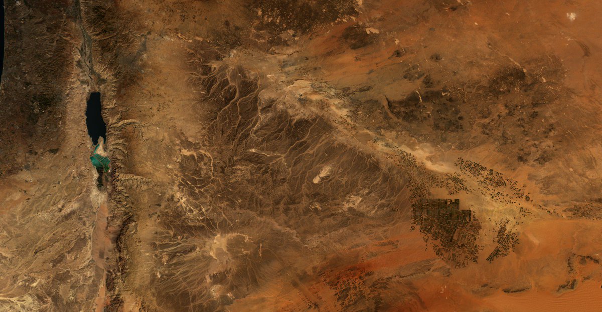 Patterns in the desert, a view by #Sentinel3 of Jordan and Saudi Arabia. Interesting to see the shapes of the fields.pic.twitter.com/4AhlN8ZyP0