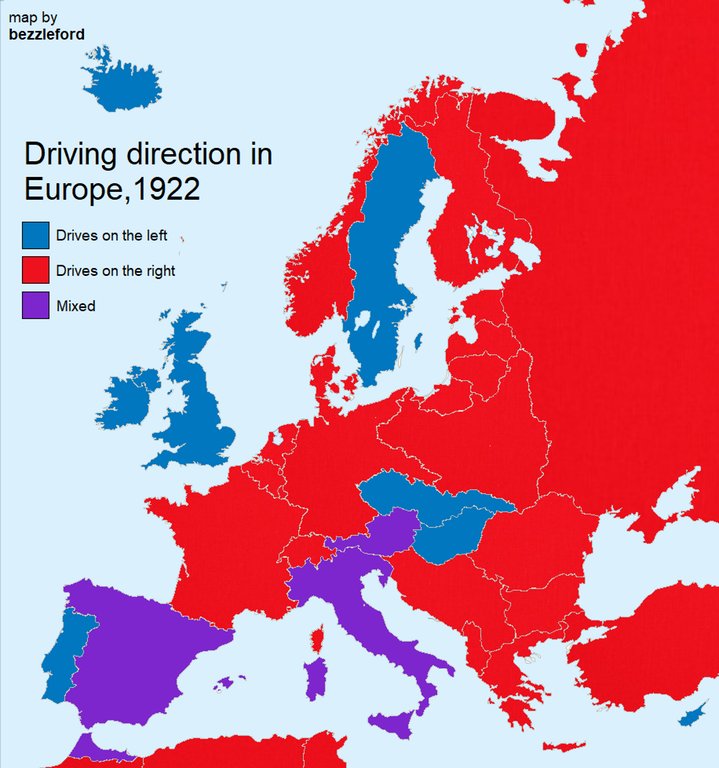 #map shows the driving direction in Europe in 1922. Go to the link and read up on the “mixed” bits. It’s fun trivia. Source: https://buff.ly/2Loclux pic.twitter.com/ivEe1yXDNG