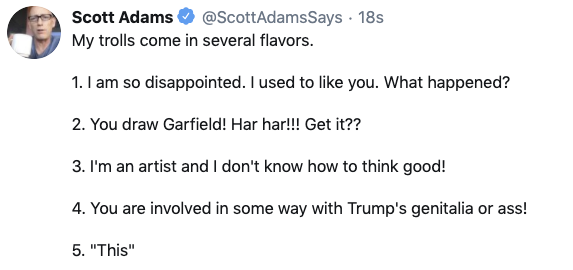 Astonishing that someone who used to earn a living crudely drawing office drones with pen and ink would sneeringly tweet "Artists" as if that were a pejorative, but 100% on brand for Scott Adams