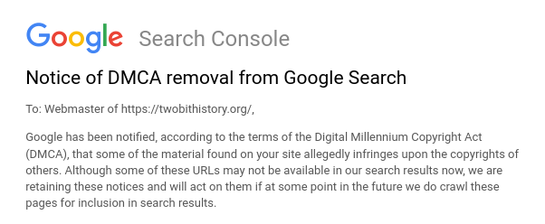 Google delisted a post on my blog because my use of the word "did" in the title apparently infringes on the reality television show "Dance India Dance." It is now MY responsibility to contest this ridiculous complaint and get my page back into the search results. Thanks