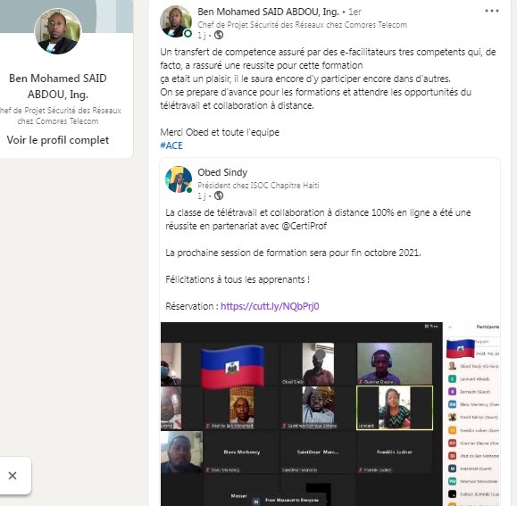 Merci à Ing. Ben Mahamed SAÏD Abdou qui a un Master 2 en ingénierie informatique et qui est maintenant chef de projet de sécurité des réseaux à Comores Telecom pour votre témoignage. Il vit actuellement en Comores