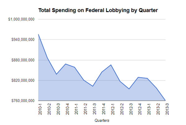 hmmm MT @OpenSecretsDC: Spending on #lobbying keeps slipping: http://bit.ly/1iy5aJS . http://www.opensecrets.org/lobby/ pic.twitter.com/pegmcsgjgM