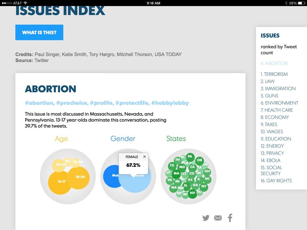 Women accounted for more than 67% of tweets about Abortion in our issues index this wknd http://www.gannett-cdn.com/experiments/usatoday/2014/10/election-topics/#topic/abortion …pic.twitter.com/Qbn1hU2H5j